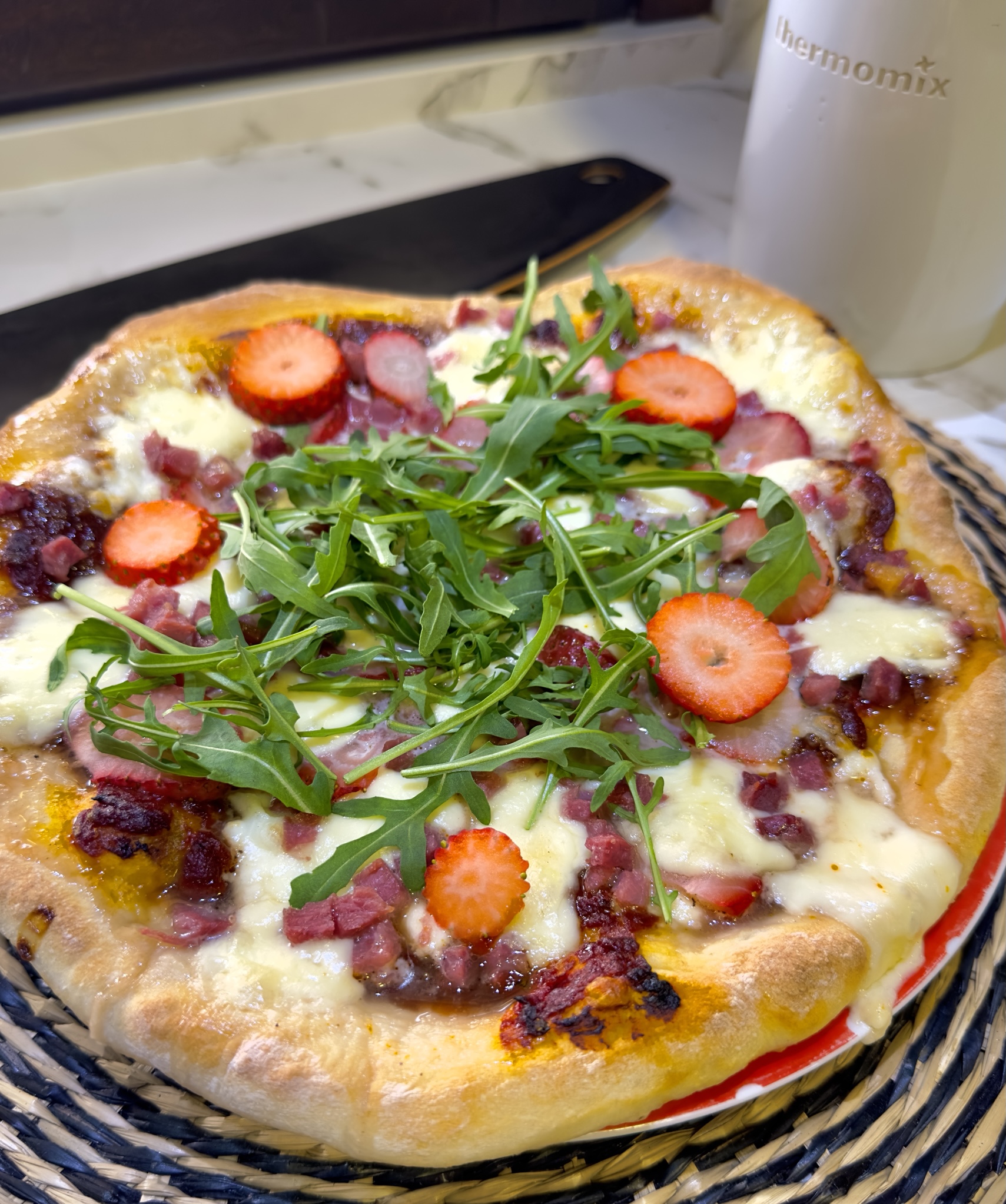 No sólo la pizza, si no probar sabores y combinaciones diferentes, como esta Pizza con mermelada casera picante de fresas, jamón y rúcula.