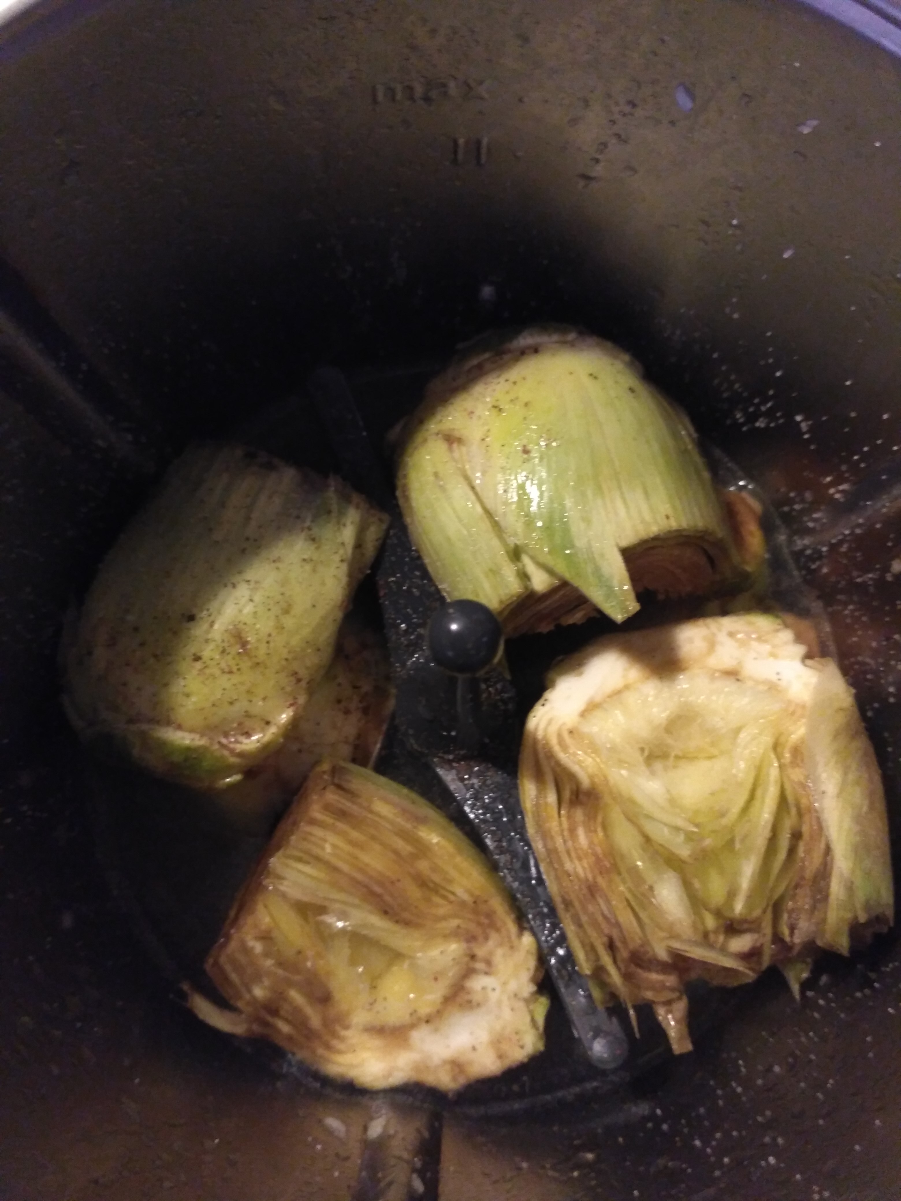 Coloque la mariposa en las cuchillas, añada las alcachofas, el agua, la sal y pimienta. Programe 15 min/100°C/vel 1.