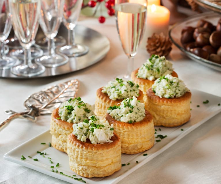 - Hornee a 180°C durante 15-20 minutos (hasta que estén dorados). Deje templar y rellene el círculo central con el bacalao reservado. Sirva espolvoreados con el cebollino picado.