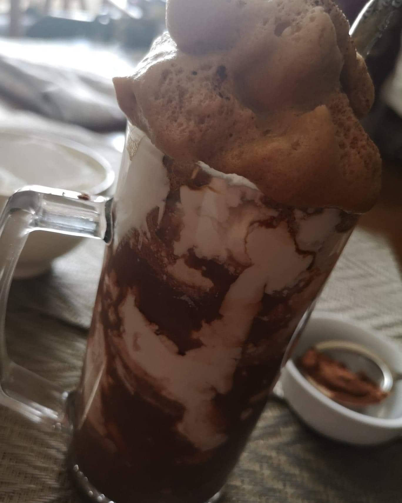 Sobre un vaso, pon el hielo, vuelca dos dedos de chocolate, encima unas cucharadas de nata montada y termina con la espuma de café.