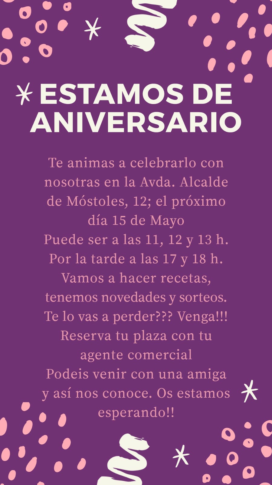 Ven a celebrar con nosotros el aniversario de nuestra delegación de Móstoles, habrá sorpresas, cada hora sorteos de cestas, regalos y muchisimas cosas más. Te lo vas a perder???? Te esperamos el día 15 en los horarios indicados en la invitación. Reserva tu plaza ya, lo pasaréis genial y degustareis nuestras recetas, que más se puede pedir