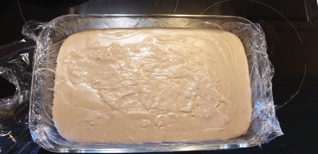 2 - Sin poner el cubilete, programe 12 min/100°C/vel 4. Vierta la crema en un molde cuadrado de aprox. 25x25 cm (tiene que quedar de un espesor de aprox. 2 cm), deje enfriar y reserve en el frigorífico durante aprox. 2 horas o hasta que esté bien cuajada.